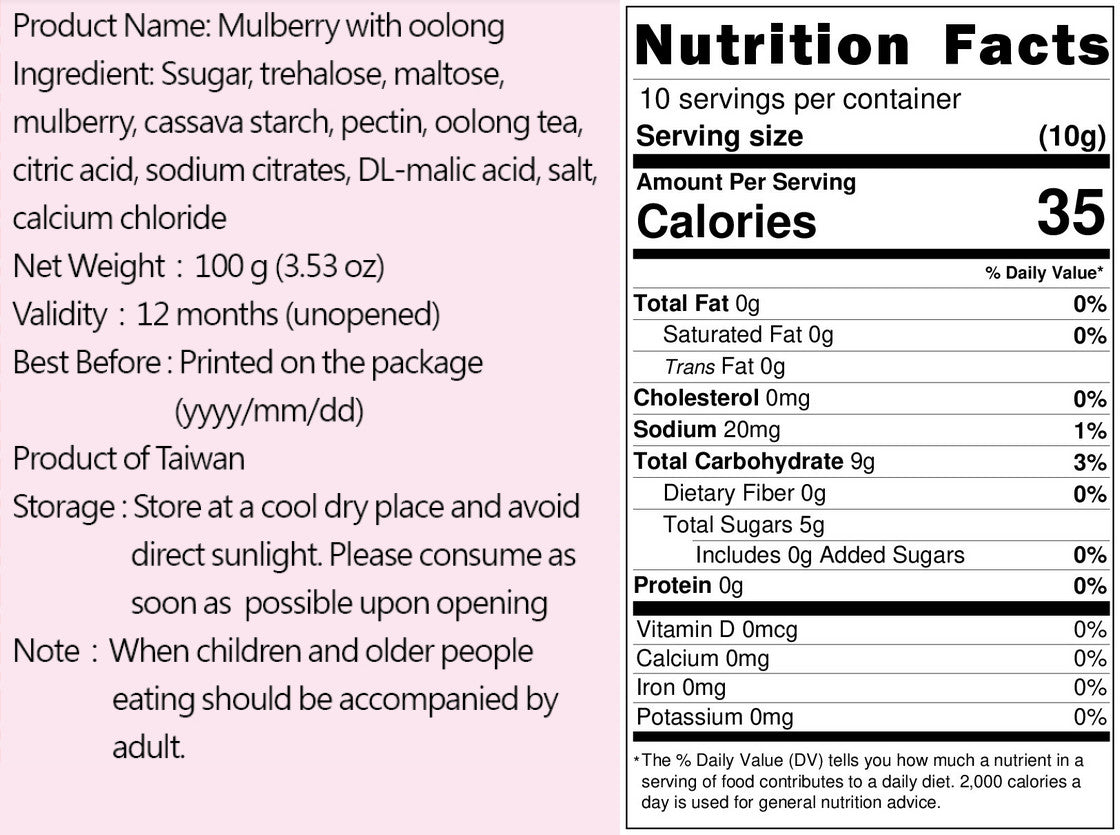 Ingredients: Sugar, Trehalose, Maltose, Mulberry, Tapioca Flour, Citrus Pectin, Oolong Tea, Citric Acid, Sodium Citrate, Malic Acid, Salt, Calcium Chloride
