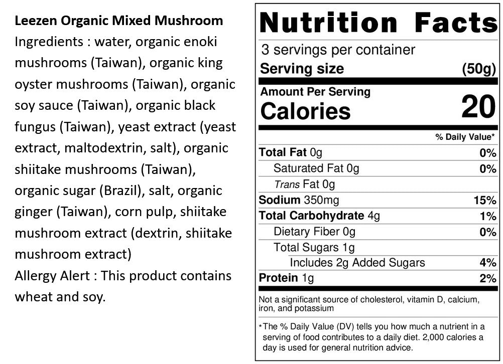 Ingredients: Water, Organic Enoki Mushrooms (Taiwan), Organic King Oyster Mushrooms (Taiwan), Organic Soy Sauce (Taiwan), Organic Black Fungus (Taiwan), Yeast Extract (Yeast Extract, Maltodextrin, Salt), Organic Shiitake Mushrooms (Taiwan), Organic Sugar (Brazil), Salt, Organic Ginger (Taiwan), Xanthan Gum, Shiitake Extract (Dextrin, Shiitake Extract)