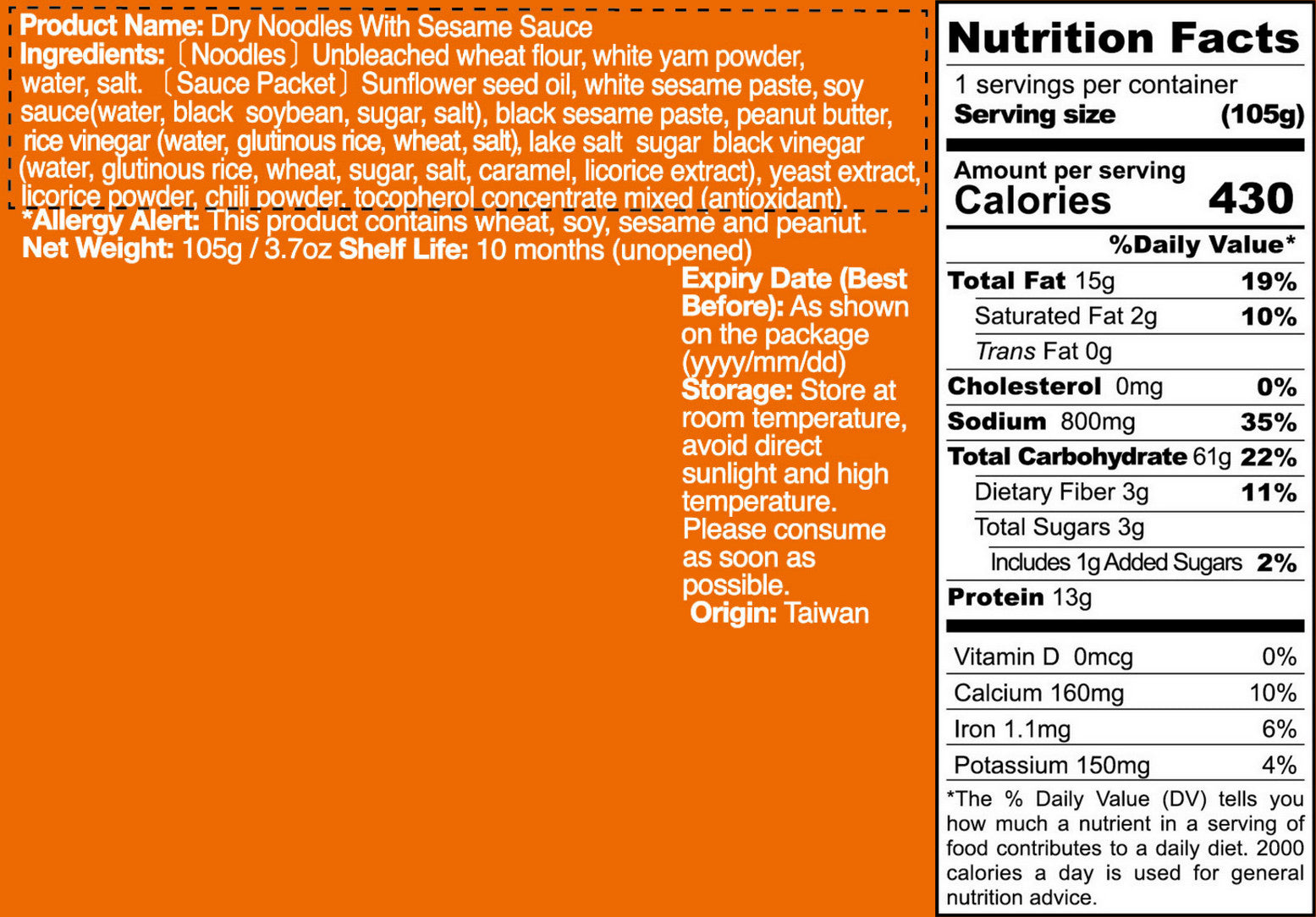 麵體蒸煮乾燥、不經油炸、不添加麵質改良劑、無添加修飾澱粉。醬料黑白芝麻溫火炒焙、雙醬黃金比例調製、無添加味素、防腐劑及人工香料。