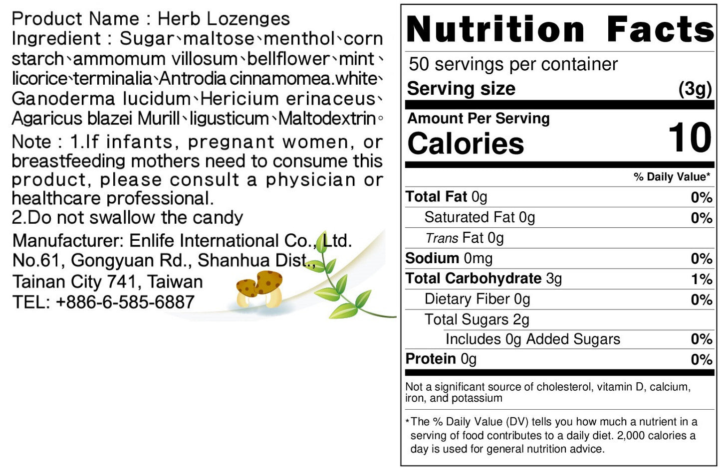 Ingredients: Sugar, maltose, mushroom mycelium fermentation liquid (Ganoderma lucidum mycelium fermentation liquid, Agaricus blazei mycelium fermentation liquid, Phellinus linteus mycelium fermentation liquid, Cordyceps sinensis mycelium fermentation liquid, Antrodia camphorata mycelium fermentation liquid), corn starch, peppermint, licorice, Ligusticum chuanxiong, Amomum villosum, Platycodon grandiflorus, dried tangerine peel, Terminalia chebula, glucose, menthol