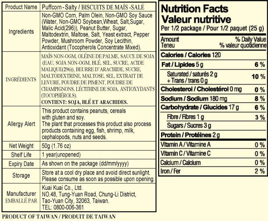 成份:玉米(非基因改造)、食用軟質棕油、醬油(非基因改造黃豆)、花生醬、砂糖、麥芽糊精、麥芽糖、鹽、酵母抽出粉、胡椒粉、香菇粉、大豆卵磷脂、抗氧化劑(混合濃縮生育醇(混合濃縮生育醇)、大豆油)
