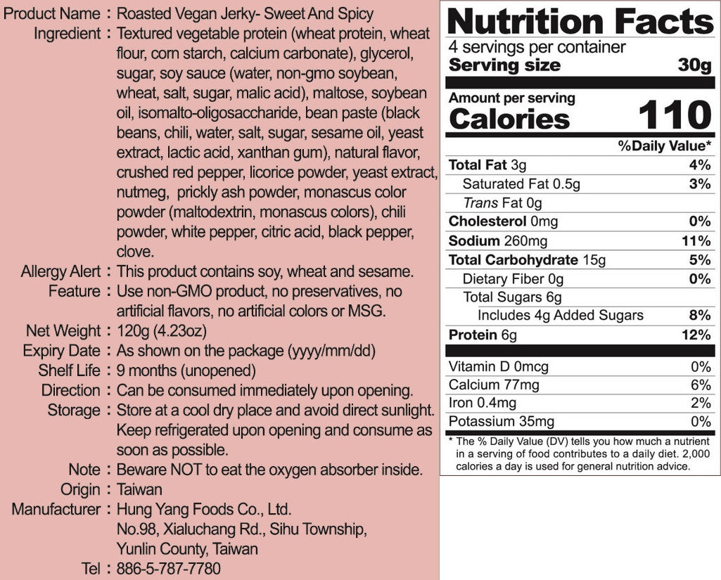 商品成分:組織化植物蛋白(小麥蛋白、高筋麵粉、玉米澱粉、大豆沙拉油、大豆卵磷脂、碳酸鈣)、甘油(品質改良劑)、砂糖、非基因改造醬油、麥芽糖、大豆沙拉油、異麥芽寡糖、黑豆瓣醬(黑豆、本產辣椒、水、鹽、糖、芝麻油、酵母抽出物、乳酸、玉米糖膠)、香料(酵母抽出物、食鹽、香料、蔗糖、油菜籽油、維生素E(抗氧化劑))、辣椒粒、甘草粉、酵母抽出物、荳蔻粉、花椒粉、紅麴精粉(麥芽糊精、紅麴色素)、辣椒粉、白胡椒粉、檸檬酸(調味劑) 、黑胡椒粉、丁香粉。