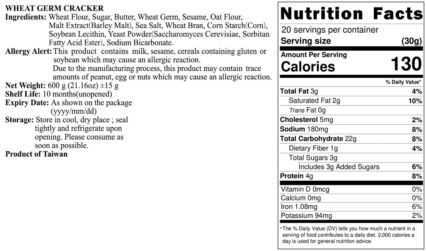 成份:小麥麵粉、砂糖、奶油、小麥胚芽、芝麻、燕麥粉、麥芽精(大麥芽)、海鹽、小麥麩皮、玉米澱粉(玉米)、大豆卵磷脂、酵母粉(酵母、脂肪酸山梨醇酐脂)、碳酸氫鈉(小蘇打)。