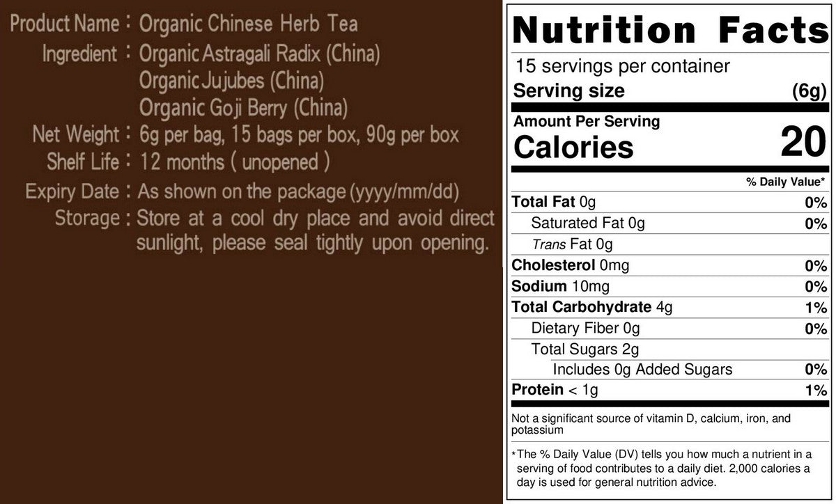 Ingredients: Pesticide-free Astragalus (China), Pesticide-free Red Dates (China), Pesticide-free Goji Berries (China)