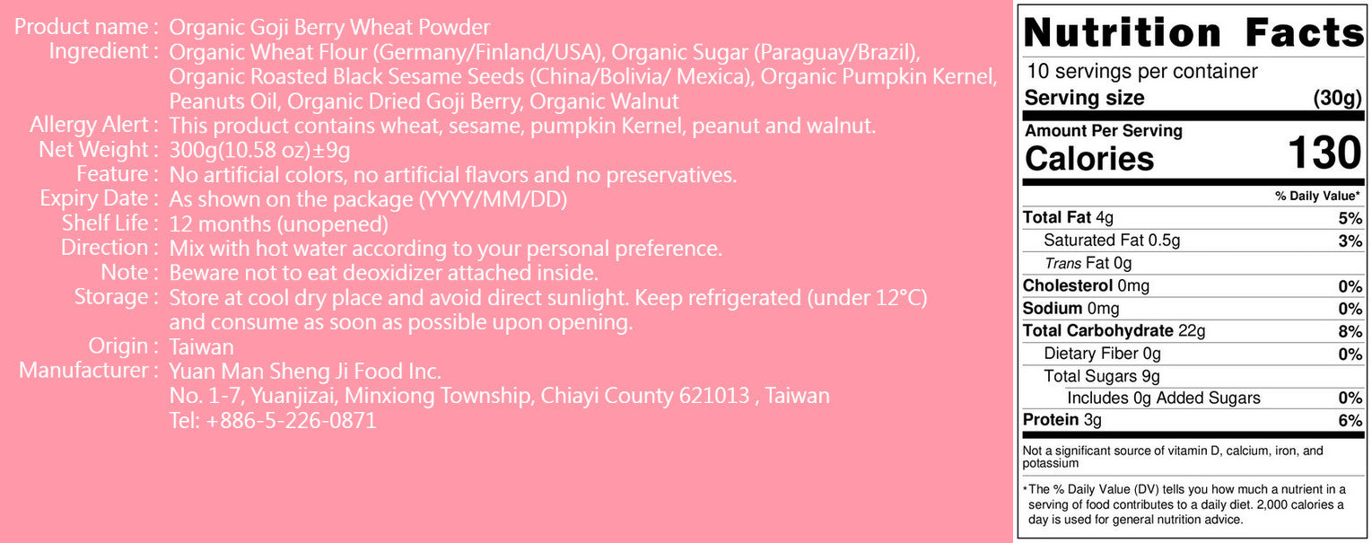 成份:有機麵粉 (德國/芬蘭/美國)、有機糖 (巴拉圭/巴西)、有機黑芝麻 (中國/玻利維亞/墨西哥)、有機葵瓜子、花生油、有機枸杞子、有機核桃。