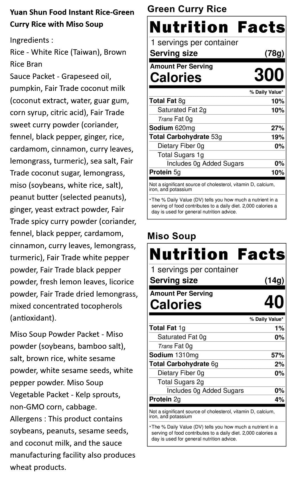 Green Curry Rice: Pour rice and sauce packet into a cup/bowl, add boiling water until nine-tenths full. Stir the curry sauce and rice evenly, then cover tightly and wait 7-8 minutes before serving. Adjust the waiting time according to personal preference.