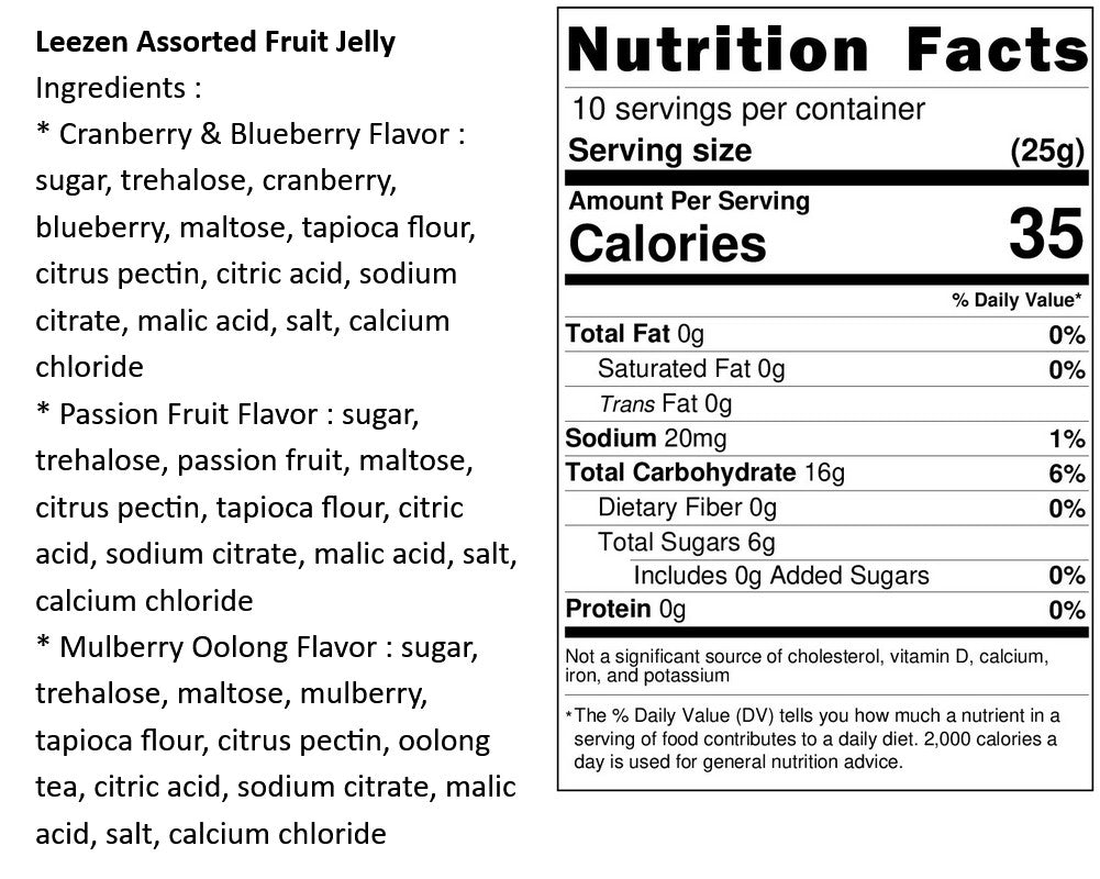 成分︰糖、海藻糖、蔓越莓、藍莓、麥芽糖、木薯粉、柑橘果膠、檸檬酸、檸檬酸鈉、蘋果酸、鹽、氯化鈣