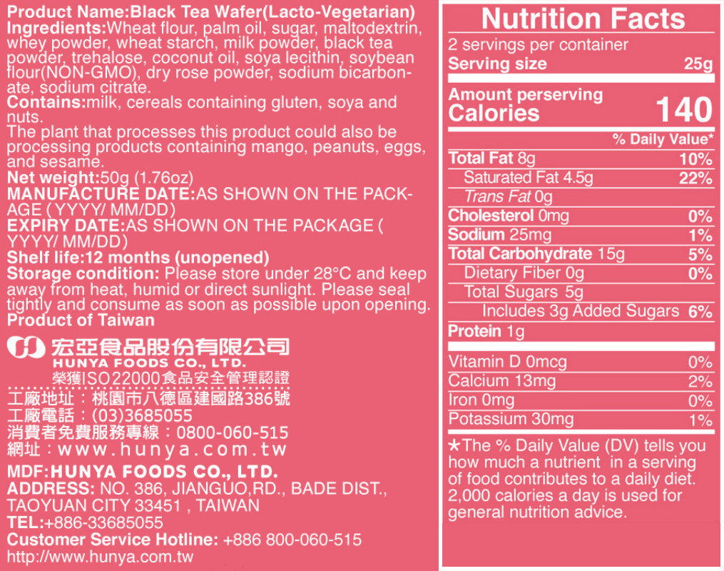 成份:棕櫚油、麵粉、蔗糖、麥芽糊精、乳清粉、奶油、小麥澱粉、紅玉紅茶粉、海藻糖、椰子油、黃豆粉(非基因改造)、玫瑰粉、碳酸氫鈉(小蘇打)、檸檬酸鈉、大豆卵磷脂