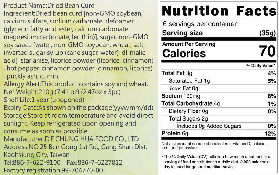 成份:大黑干[非基因改造黃豆、豆腐用凝固劑(硫酸鈣)、無水碳酸鈉、消泡劑(脂肪酸甘油酯、碳酸鈣、碳酸鎂、卵磷脂)]、糖、非基因改造黃豆醬油、八角、甘草粉(甘草、肉桂)、雞心椒粉、肉桂粉(肉桂、甘草)、花椒、孜然