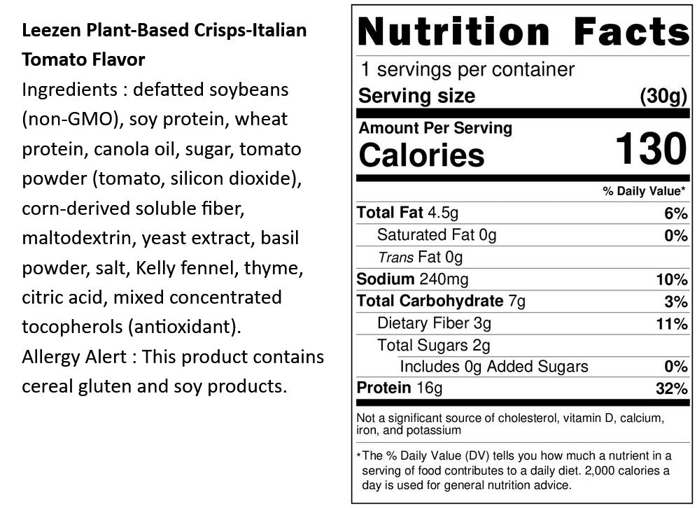 追求健康與環境永續的現代生活中,「義式番茄植物蛋白脆」為您帶來創新的零食選擇。每份含有豐富的15.5克蛋白質,這些蛋白質來自於非基改脫脂黃豆和其他植物來源,符合現代人健康與營養的雙重需求。