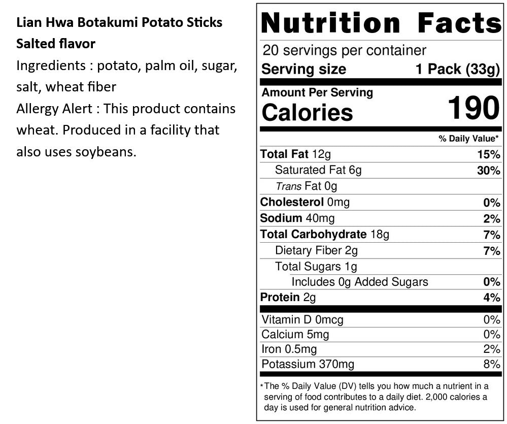 成份:馬鈴薯、棕櫚油、糖、湖鹽、小麥纖維