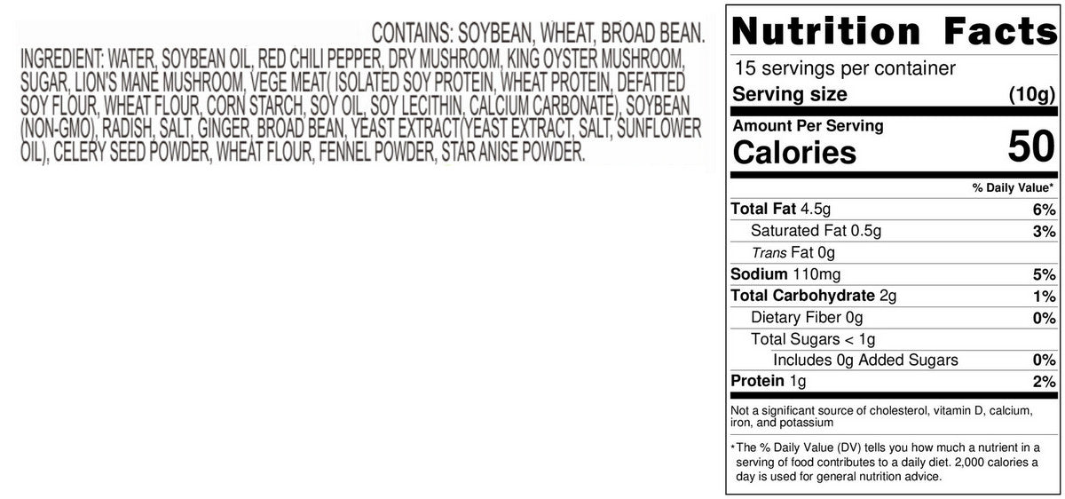 Ingredients: Water, soybean oil, Taiwanese red chili peppers, dried shiitake mushrooms, king oyster mushrooms, sugar, non-GMO soybeans, textured soy protein (non-GMO), isolated soy protein (non-GMO), wheat protein, defatted soy flour (non-GMO), Taiwanese turnip, sucrose syrup, corn starch, soy lecithin, salt, broad beans, ginger, flour, parsley powder, yeast extract, fennel powder, calcium carbonate, star anise powder