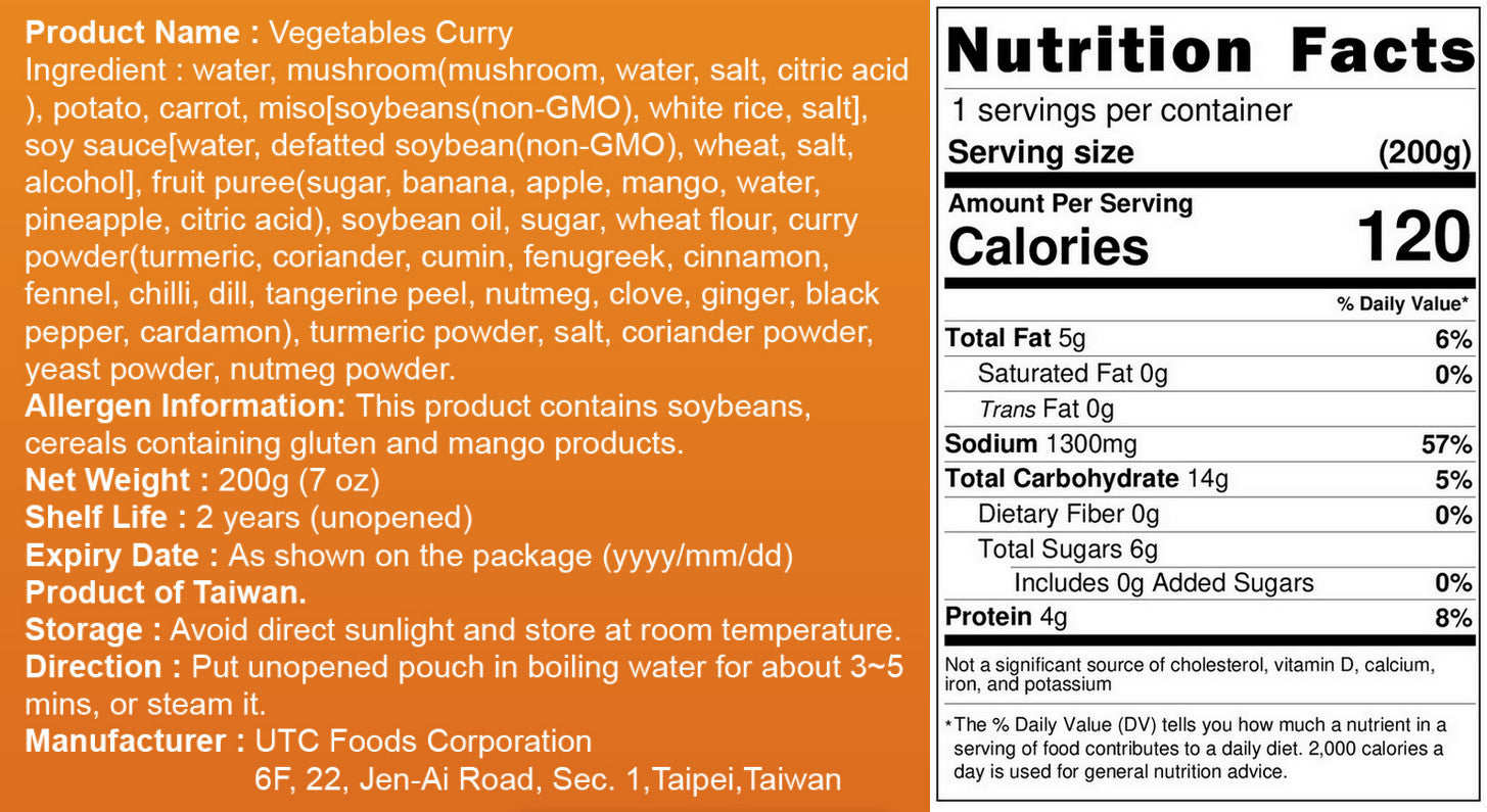Water, Sliced Button Mushrooms (Button Mushrooms, Water, Salt, Citric Acid), Potato, Carrot, Miso [Soybeans (Non-GMO), White Rice, Salt], Soy Sauce, Fruit Puree (Sugar, Banana, Apple Puree, Mango Pulp, Water, Pineapple Concentrate, Citric Acid), Soybean Salad Oil, Sugar, Wheat Flour, Curry Powder (Turmeric, Coriander, Cumin, Fenugreek, Cinnamon, Fennel, Chili, Dill, Dried Orange Peel, Nutmeg, Cloves, Ginger, Black Pepper, Cardamom), Turmeric Powder, Salt, Coriander Powder, Yeast Powder, Cardamom Powder.
