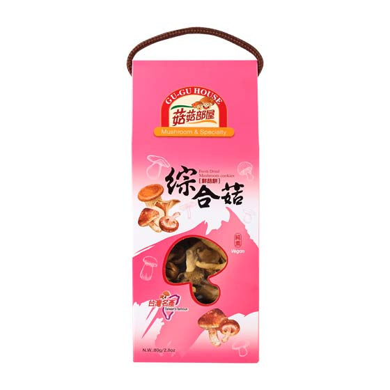 採用100%新鮮菇以真空乾燥技術製作,保留鮮菇的鮮脆、並無任何人工添加物,內有香菇、秀珍菇、杏鮑菇等三種菇類,適合全家一起享用的休閒食品。經低溫真空油炸含油率低,只加上少許海鹽調味帶出新鮮菇類本身鮮甜。