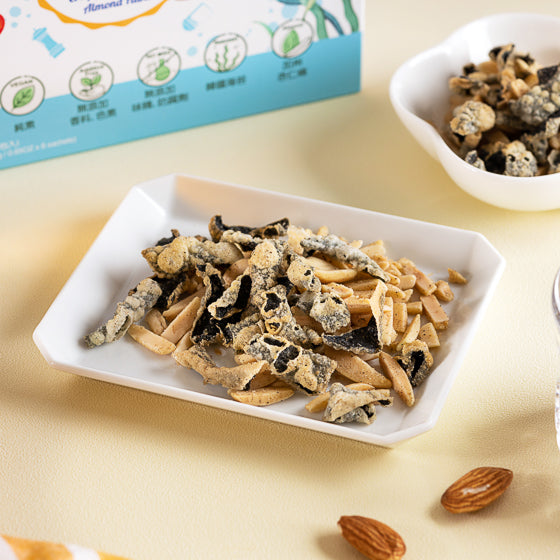 採用口感更加香脆加州杏仁條,搭配嚴選香氣清新的韓國海苔以獨門秘方特製素小餘,佐以胡椒鹽調味,香酥順口。