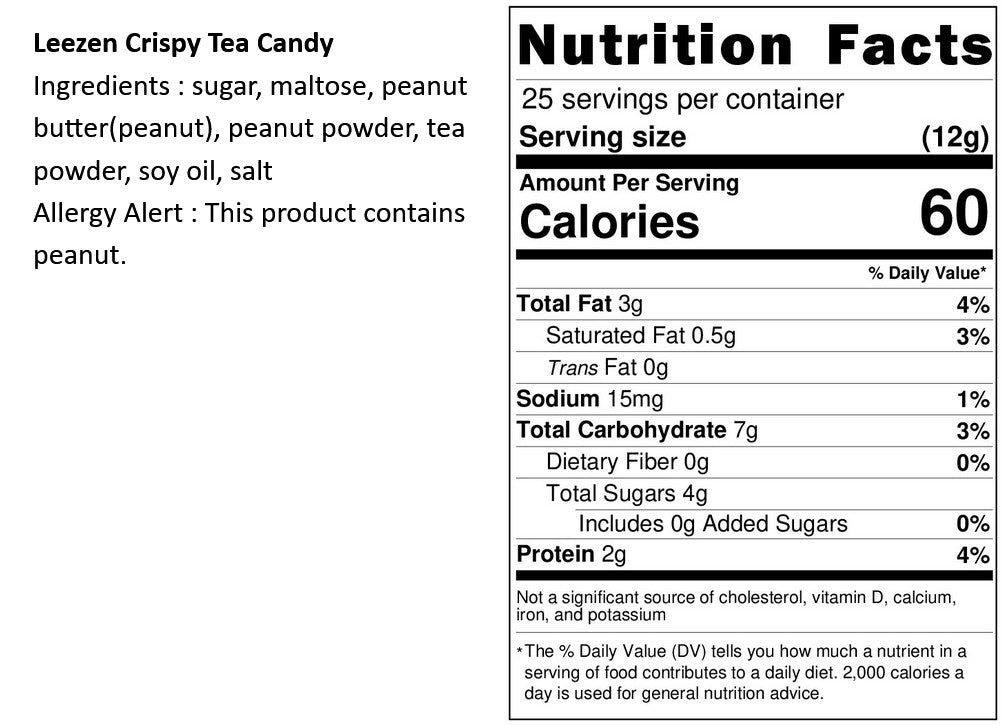 Ingredients: sugar, maltose, Golden Crown natural tea powder, peanut butter, peanut powder, salt, salad oil
