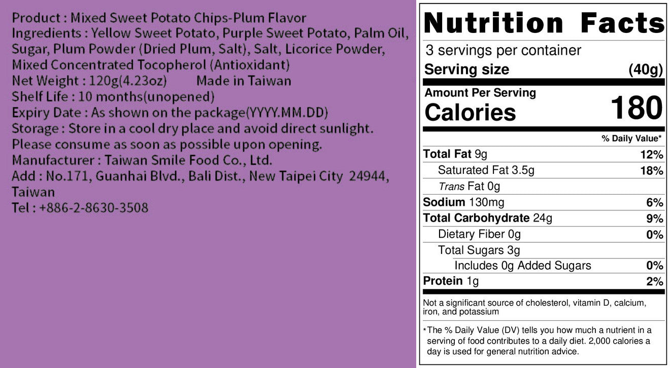 Ingredients: Golden Sweet Potato, Purple Sweet Potato, Palm Oil, Sugar, Plum Powder (Dried Plum, Salt), Himalayan Rose Rock Salt, Licorice Powder, Mixed Concentrated Tocopherols (Antioxidant)
