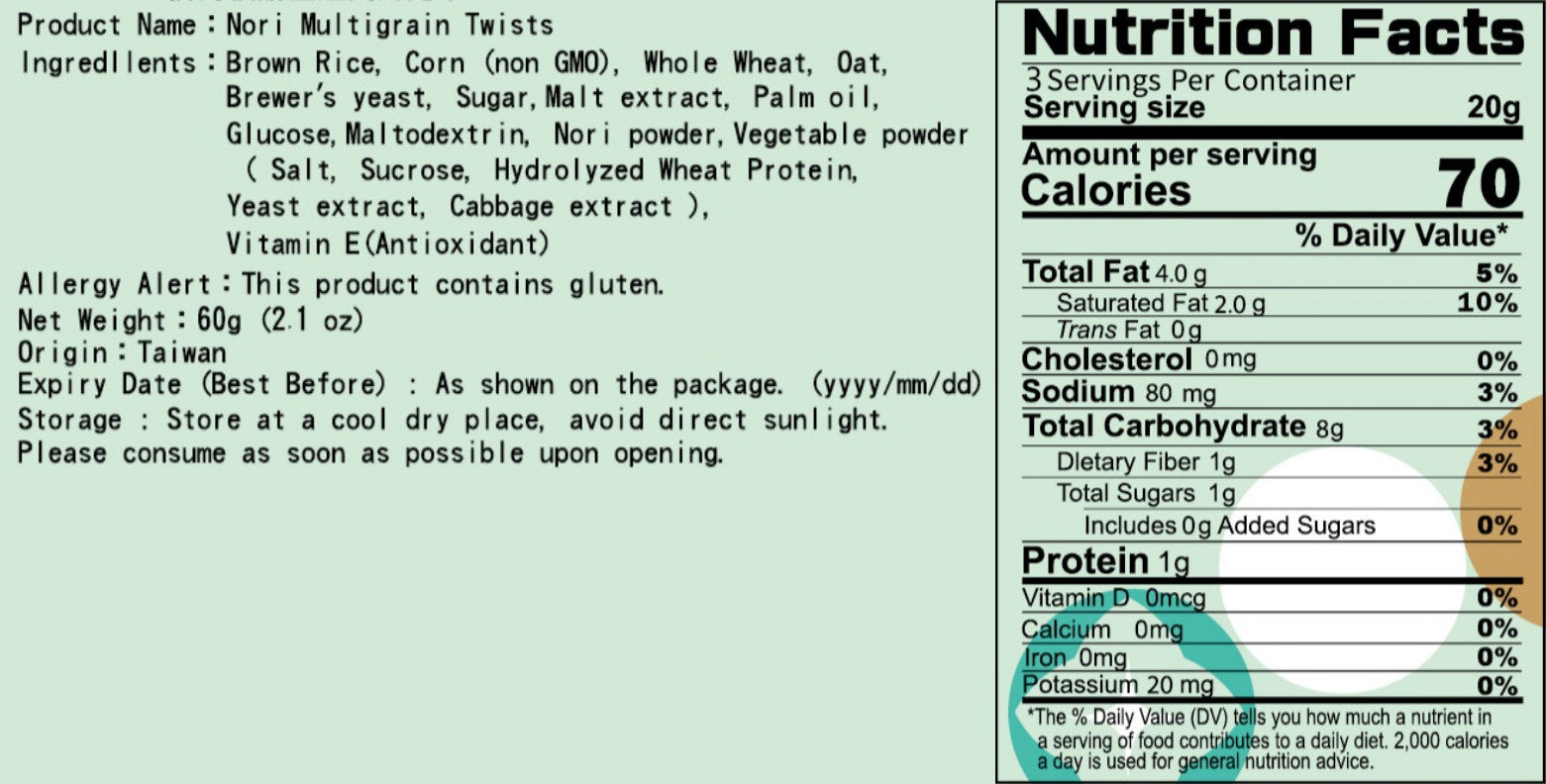 成分: 糙米,玉米(非基改),白麥,燕麥,木糖酵母粉,麥芽精,食用軟質棕櫚油,葡萄糖,麥芽糊精,海苔粉,蔬菜粉(鹽,蔗糖,小麥水解蛋白,酵母抽出物,高麗菜抽出物),維他命E-抗氧化劑(混合濃縮生育醇)