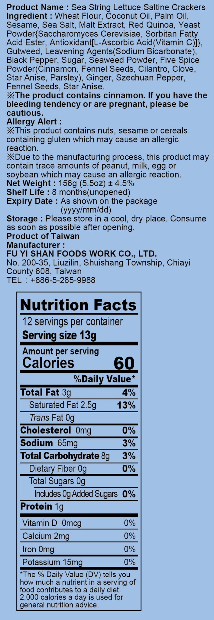成分:小麥麵粉、椰子油、棕櫚油、芝麻、海鹽、麥芽精、紅藜、酵母粉{酵母、脂肪酸山梨醇酐酯、抗氧化劑〔L-抗壞血酸(維生素C)〕}、滸苔粉、碳酸氫鈉(小蘇打)、黑胡椒、特砂、海苔粉、五香粉(肉桂、小茴香、胡荽、丁香、八角、香芹)、薑、花椒、小茴香粒、八角粒。