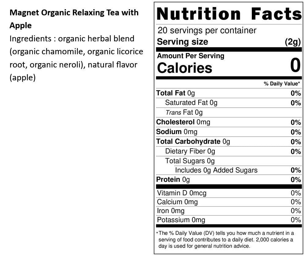Ingredients: Pesticide-free chamomile, Pesticide-free licorice root, natural flavoring (apple), Pesticide-free orange blossom