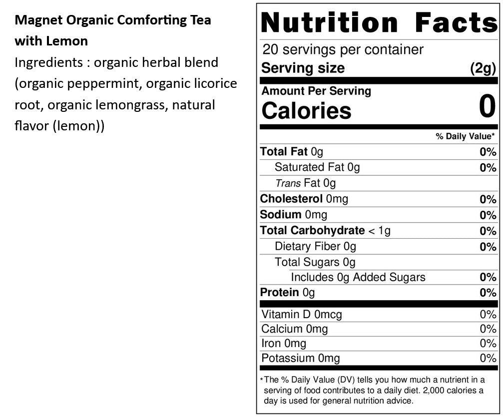 Ingredients: pesticide-free mint leaves, pesticide-free licorice root, pesticide-free lemongrass, natural flavoring (lemon)