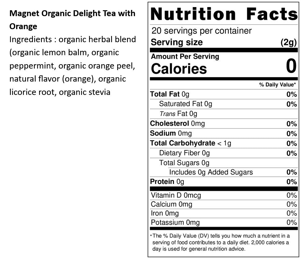 Ingredients: pesticide-free lemon balm, pesticide-free mint, pesticide-free orange peel, natural flavoring (orange), pesticide-free licorice, pesticide-free stevia leaves