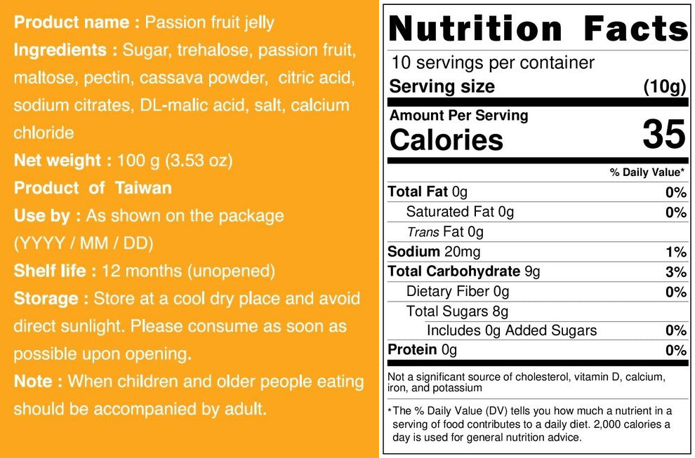 成份:糖、海藻糖、百香果、麥芽糖、柑橘果膠、木薯粉、檸檬酸、檸檬酸鈉、蘋果酸、鹽、氯化鈣