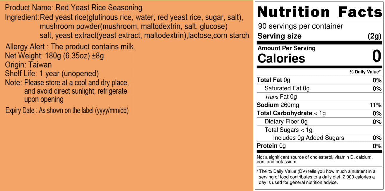 成份:紅麴 (糯米、水、紅麴、糖、鹽)、香菇、香菇粉 (糊精、香菇萃取物)、鹽、酵母抽出物 (酵母抽出物、麥芽糊精)、乳糖、玉米澱粉