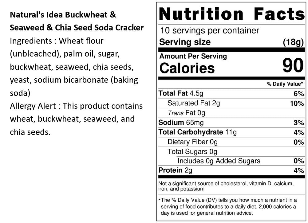 成 份 小麥麵粉(無漂白)、棕櫚油、糖、蕎麥、紫菜、奇亞籽(鼠尾草籽)、酵母粉、碳酸氫鈉(食用小蘇打)