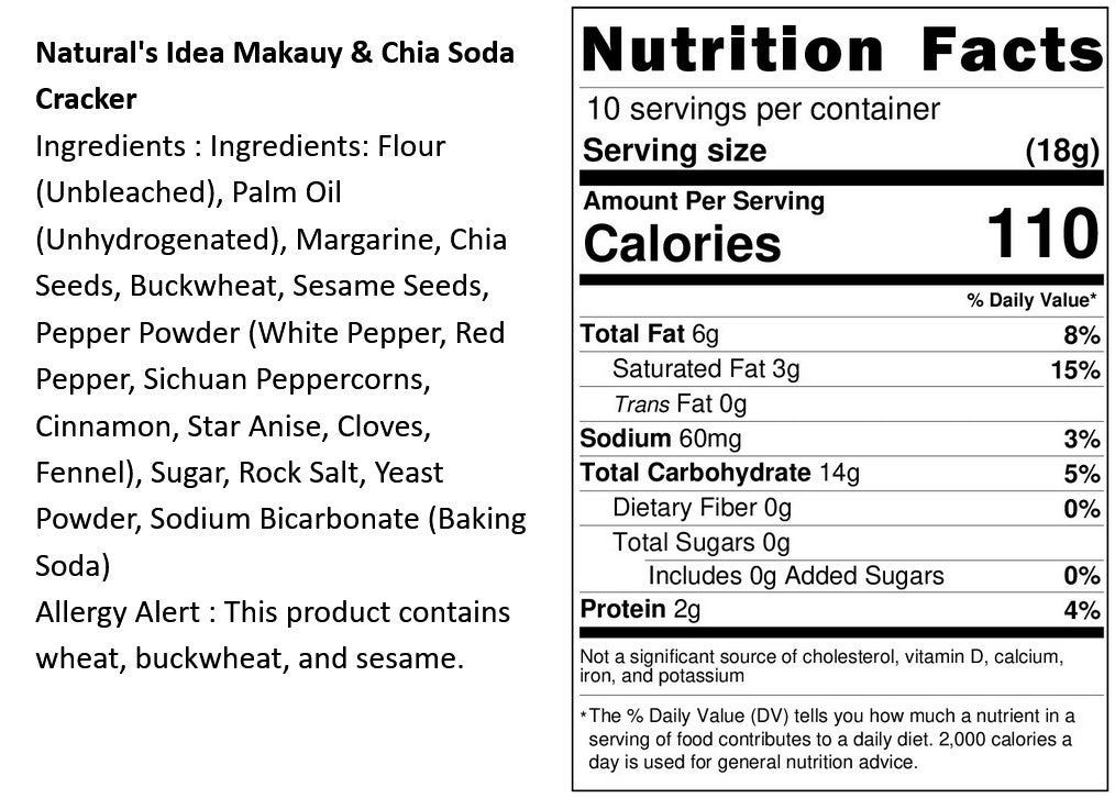 Ingredients: Flour (Unbleached), Palm Oil (Unhydrogenated), Margarine, Chia Seeds, Buckwheat, Sesame Seeds, Pepper Powder (White Pepper, Red Pepper, Sichuan Peppercorns, Cinnamon, Star Anise, Cloves, Fennel), Sugar, Rock Salt, Yeast Powder, Sodium Bicarbonate (Baking Soda)