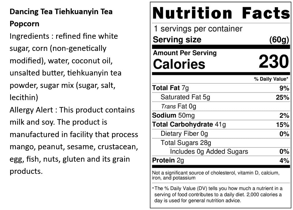 成分:爆糖(砂糖、鹽、卵磷脂)、玉米(非基因改造)、椰子油、無鹽奶油(乳脂、水、非乳脂固體)、鐵觀音茶粉