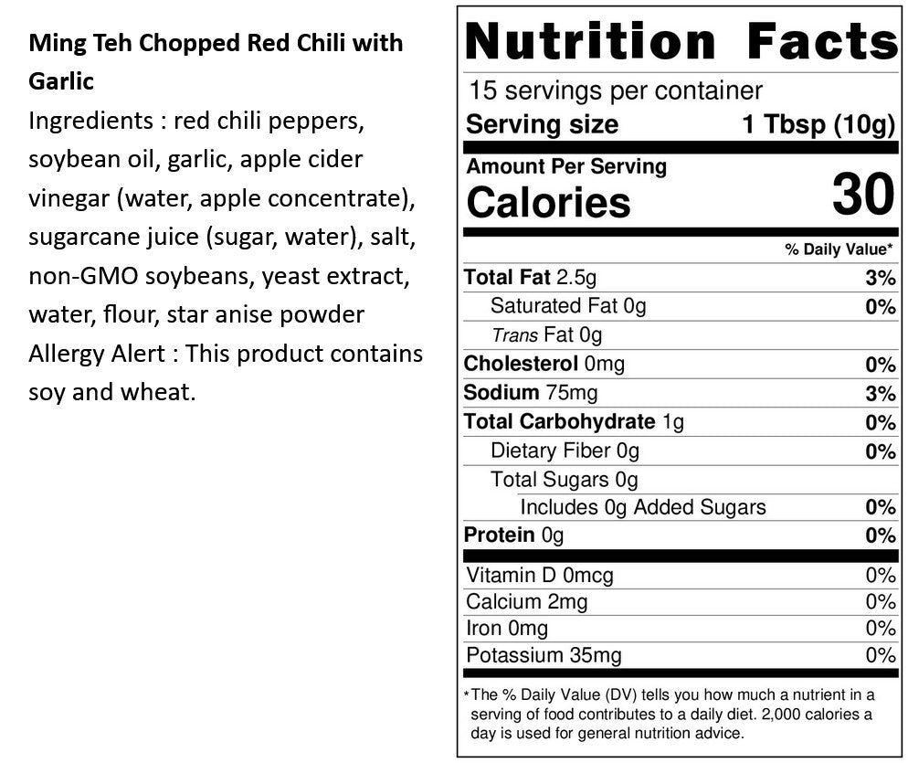 Taiwanese Red Chili, Soybean Oil, Garlic, Apple Cider Vinegar (Water, Apple Juice Concentrate), Liquid Cane Sugar (Sugar, Water), Salt, Non-GMO Soybeans, Yeast Extract, Water, Wheat Flour, Star Anise Powder.