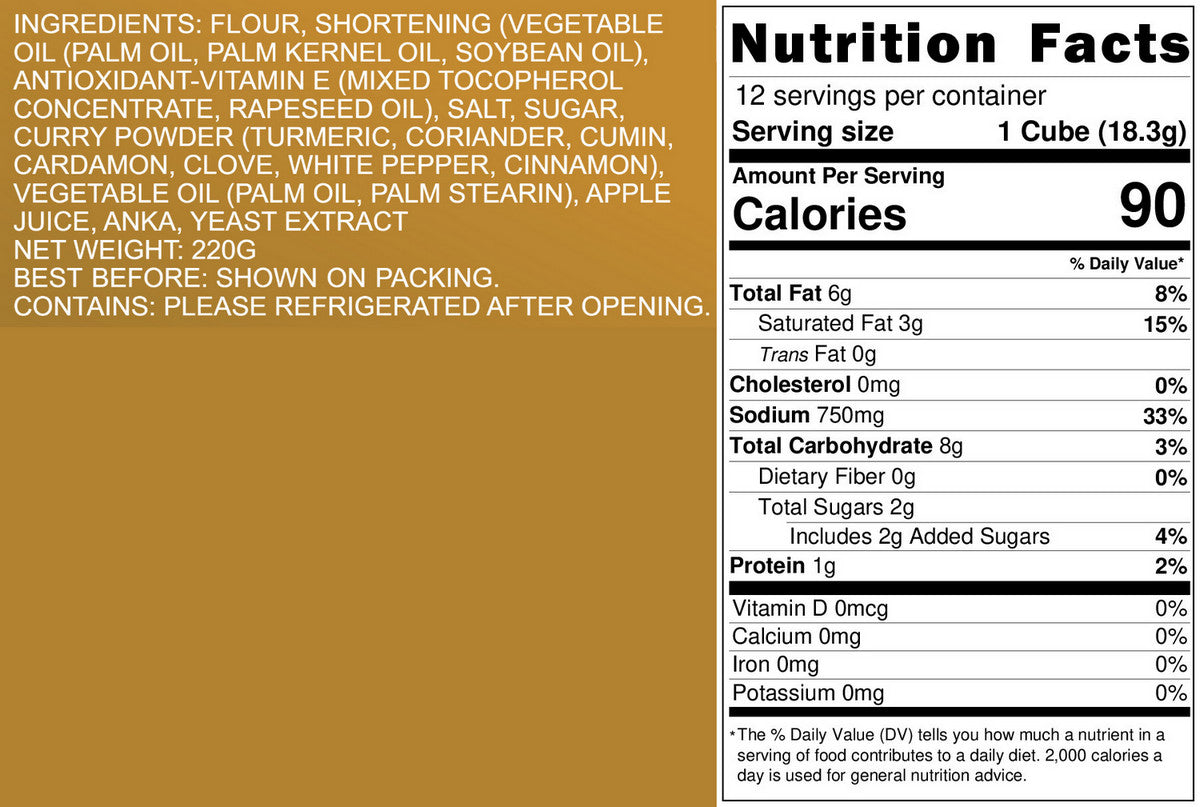 成分: 麵粉,乳化油(植物油(棕櫚油,棕櫚仁油,大豆油),抗氧化劑-維生素E(混合濃縮生育醇,芥花油)),鹽,糖,咖哩粉(薑黃粉,胡荽,小茴香,綠荳蔻,丁香,白胡椒,肉桂),植物油(棕櫚油,硬質棕油),蘋果濃縮汁,紅麴,酵母抽出物