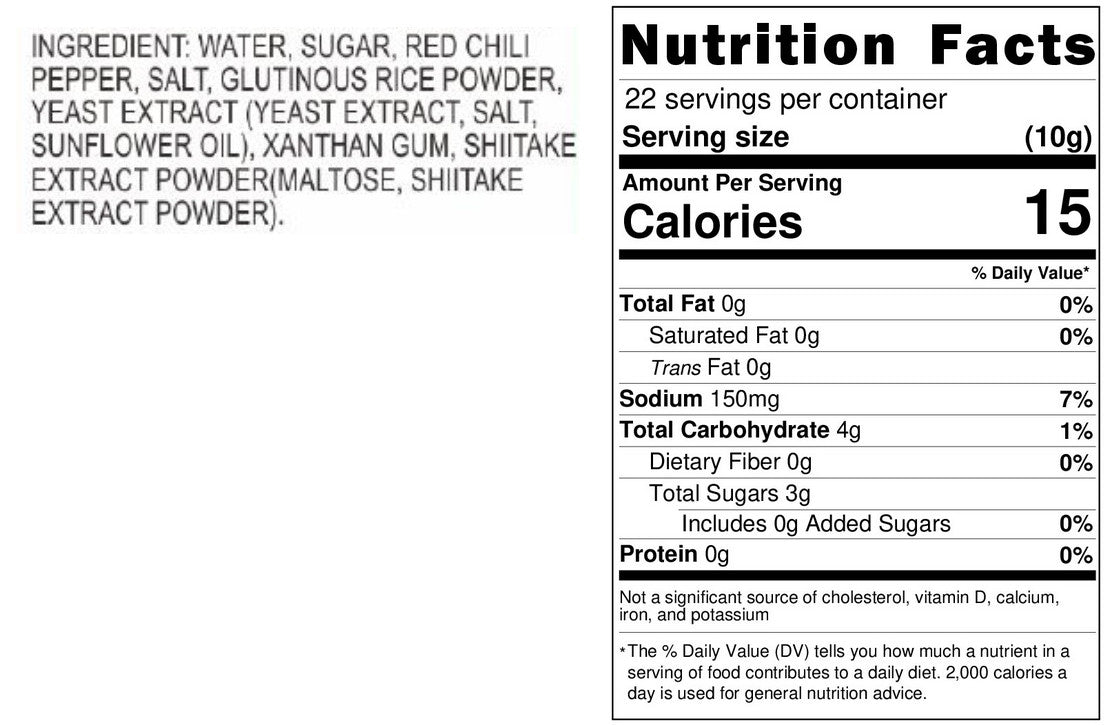 Ingredients: Water, sugar, Taiwanese red chili peppers, salt, glutinous rice flour, yeast extract, corn syrup, shiitake mushroom extract (dextrin, shiitake mushroom extract)