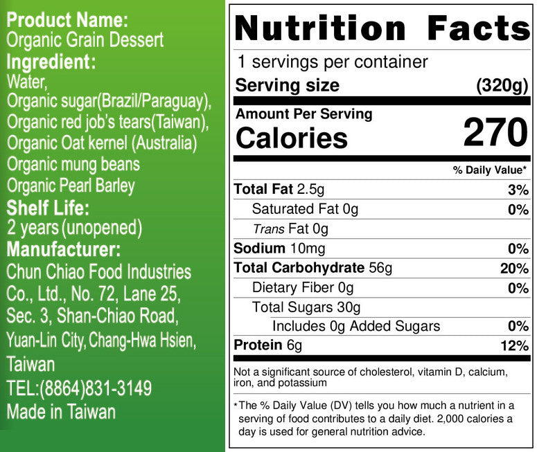 成分:水,有機糖(巴西,巴拉圭),有機紅薏仁(台灣),有機燕麥仁(澳洲),有機綠豆,有機大麥