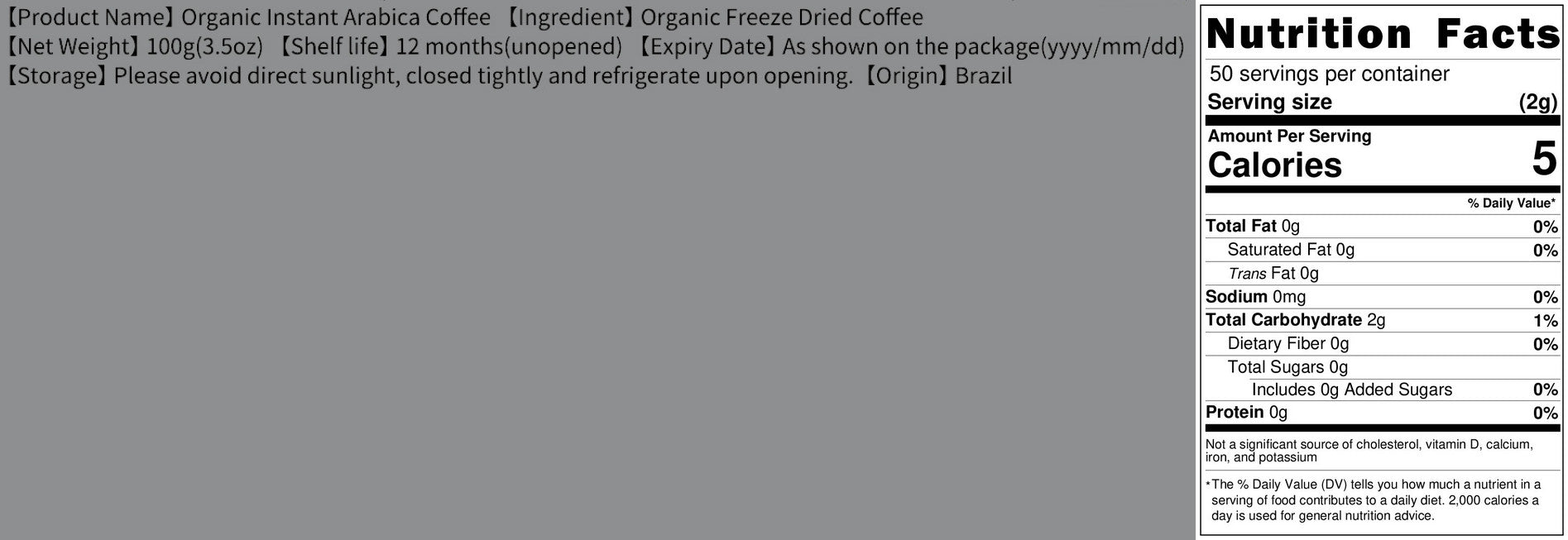 2. Each serving contains 62.8 mg of caffeine. (Coffee bean is a natural agricultural product, and its caffeine content is easily affected by factors such as origin and season.)