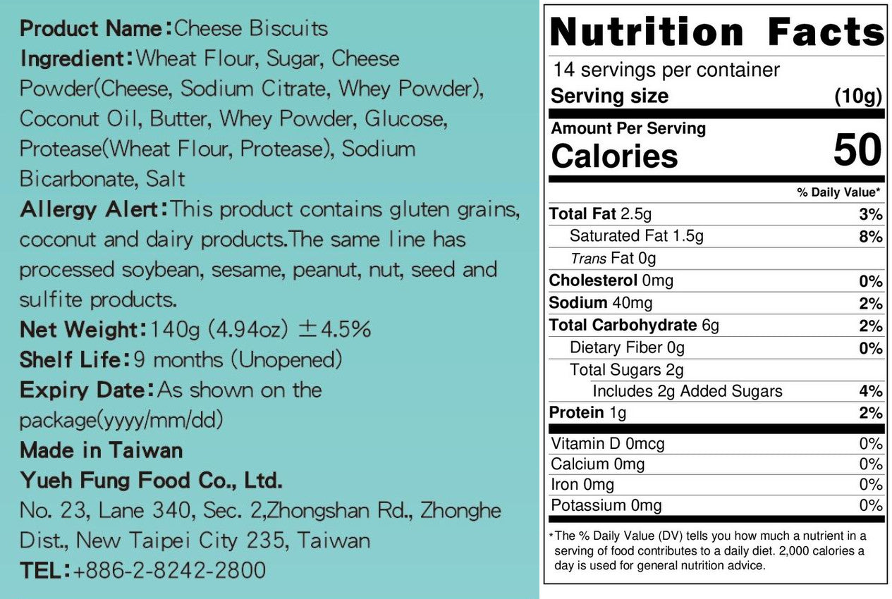 成份:喜願麵粉、糖、芝士粉(乾酪、檸檬酸鈉、乳清粉)、椰子油、發酵奶油、乳清粉、葡萄糖、蛋白分解酵素(小麥粉、蛋白分解酵素)、小蘇打、鹽