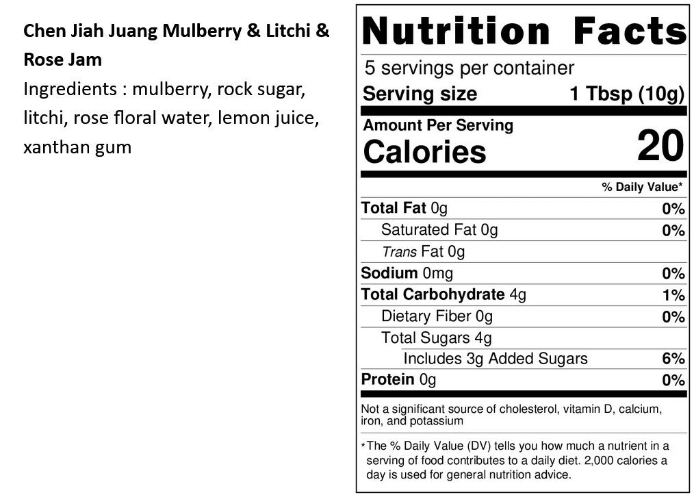 Ingredients:Mulberry (Taiwan), Rock Sugar (Taiwan), Litchi (Taiwan), Rose Floral Water (Taiwan), Lemon Juice (Taiwan), Xanthan Gum.