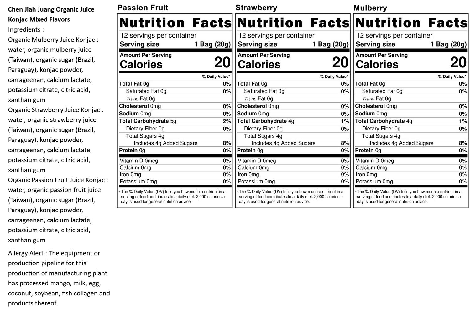 Passion Fruit: Water, pesticides free Passion Fruit Juice (Taiwan), Kirkland pesticides free Cane Sugar (Brazil), Konjac Powder, Carrageenan, Calcium Lactate, Potassium Citrate, Citric Acid, Corn Pulp.