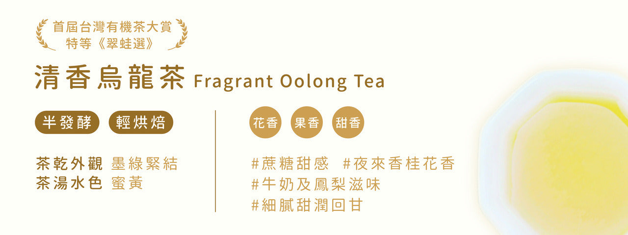 坪林地區山環水繞水氣豐沛,得天獨厚的環境造就台灣北部最富盛名的條型茶種—包種茶,與南部烏龍茶共享「北包種,南烏龍」的美名。這款茶就是採用坪林當地有機茶菁,以早期包種茶製造工藝製成。茶湯呈包種茶經典蜜綠色,由於有機茶的發酵度比較重,蜜綠中又透著微黃,風味清新幽雅的花香。